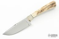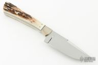This knife from Robert Champion features a mirror finished clip point blade with .166” blade stock and 1.125” blade depth, full tapered tang construction. The handle is comprised of nickel silver bolsters, stag scales with black liners and nickel silver pins. Comes with zipper case. Has some light scuffs, scratches, and patina. Excellent condition otherwise.