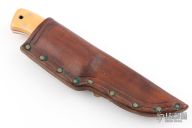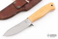 This Semi-Skinner by Wayne Goddard features a satin polish finished blade with .133" blade stock and 1.009" blade depth, full tang construction. The handle has a nickel silver guard, micarta covers, and silver pins. Comes with a brown leather sheath, and zipper case. Has some light scuffs, scratches, and patina, excellent condition otherwise.