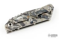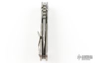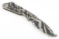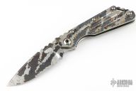 This Mick Strider Performance Series SMF framelock folder features a laser engraved spear point blade with thumbhole and notched thumbrest. The handle has a stonewashed and laser engraved titanium frame with titanium clip, tip up carry. Jimping on blade spine. Includes Hinderer "Lock Bar Stabilizer" for maximum reverse lock retention. Nice detent, lockup and blade seating. New condition.