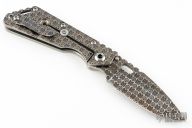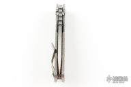 This Mick Strider Performance Series SMF framelock folder features a laser engraved spear point blade with thumbhole and notched thumbrest. The handle has a stonewashed and laser engraved titanium frame with titanium clip, tip up carry. Jimping on blade spine. Includes Hinderer "Lock Bar Stabilizer" for maximum reverse lock retention. Nice detent, lockup and blade seating. New condition.
