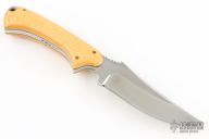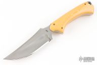 This Skinner by Scott Costa features an upswept mirror polished blade with notched thumbramp, false top edge, .215" blade stock and 1.210" blade depth, full tang construction. The handle has pinned vintage paper micarta scales. Comes with a zipper case. Has some light scuffs, excellent condition otherwise.