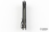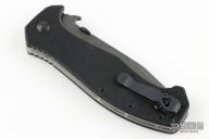 This CQC-15 TFS from Emerson Knives has a thunderstorm finished tanto recurve blade with thumb disc and notched thumb rest. Handle is black G10 with titanium liners, black barrel spacers, lanyard hole and deep carry tip up black stainless steel clip. Nice detent, lockup and blade seating. S/N 0122 and dated 2013. Comes with original box and clip. Excellent condition.