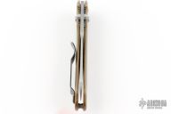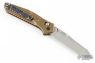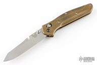 This 940BK Osborne Axis Lock Folder from Benchmade has a satin finished blade with false top edge and dual thumbstuds. Handle has custom brass scales, stainless posts, and black finished stainless steel tip up clip. Comes with original box, papers, and drawstring pouch. Brass has patina, excellent condition otherwise.