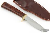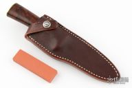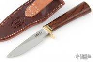 This Model 26 Pathfinder by Randall Made Knives is one of Randall's best selling models. It features a drop point satin finished blade with .164" blade stock and .925" blade depth, hidden tang construction. The handle has a brass guard and butt plate, desert ironwood burl grip and black/brass spacers. Comes with a brown leather sheath and sharpening stone. Excellent condition.