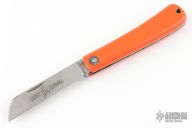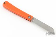 The Handle: Thick, durable orange Delrin handle scales have been pinned to stainless steel liners and secured with a brass lanyard tube, pin and steel pivot pin. The Delrin is chamfered for a comfortable feel in-hand while the safety orange does its best to help you never lose it. The butt end of the handle sweeps up to balance out the blade.