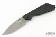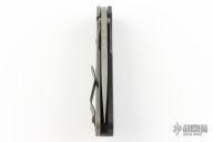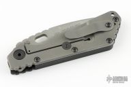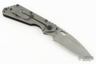 This Mick Strider SMF Fatty framelock folder features a bead blasted blade with thumbhole and notched thumbrest. The handle has a black aluminum and bead blast finish titanium frame with titanium clip, tip up carry. Jimping on blade spine. Nice lockup, detent, and blade seating. NSN: 1095-01-531-5015. Has some scuffs, otherwise excellent condition.