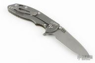 This XM-18 3.5" flipper by Rick Hinderer features a working finished blade with notched thumbrest and flipper. The handle has a working finished titanium frame with a green G-10 scale, a tip up or down reversible titanium clip and filler tab, lanyard hole at the butt. Comes with original box. Excellent condition.