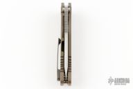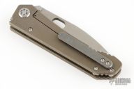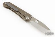This 187 DPT Drop Point by Medford Knife and Tool features a stonewashed drop point blade with notched thumbrest and thumbhole. The handle has a stonewashed and anodized titanium frame and clip. Nice blade seating, detent and lockup. Comes with original box, pouch and dog tag. Excellent condition.