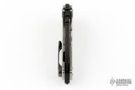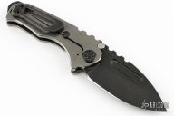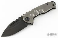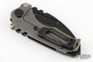 This Micro Praetorian from Medford Knife and Tool features a black finished drop point blade with notched thumbrest and fullers. The handle has a stonewashed titanium frame with a black titanium tip up pocket clip. Stainless steel backspacer doubles as a glass breaker. Comes with original hard case and papers dated Jan 18, 2022. Excellent condition.