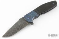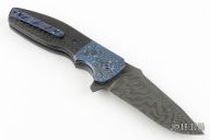 This Augustus Flipper by Kirby Lambert features a Damascus blade with notched thumbrest and flipper. The handle has zircuti bolsters, carbon fiber scales, bead blasted and anodized titanium liners, floating carbon fiber backspacer, and a tip up zircuti clip, anodized titanium hardware and copper pivot collars. Nice detent, lockup and blade seating, rides on bearings. Comes with nylon zippered case. Excellent condition.