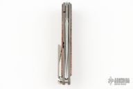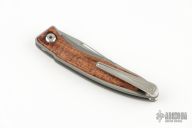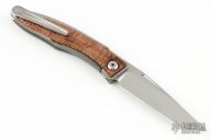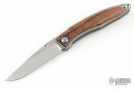 This Mnandi has a satin finished blade with notched thumbrest and nail nick. The handle has a bead blasted and satin finished titanium frame with Thuya inlays. Titanium clip, tip up carry. Comes with original box and papers dated May 15, 2018. Also includes leather slip, cloth, and lube/tool. Excellent condition.