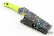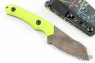 This Midsize Harpoon by Tactical Pterodactyl features a sheepsfoot Magnacut blade with a notched thumbrest, .155" blade stock and 1.070" blade depth, full tang construction. The handle has bright neon yellow G-10 scales. Comes with a kydex sheath and COA. Excellent condition.