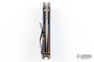 This PT by Mick Strider features a stonewashed blade with notched thumbrest and thumbhole. The handle has a blue anodized titanium frame with matching tip up clip. Excellent condition.