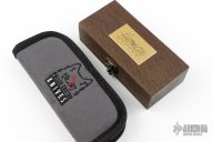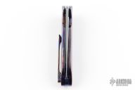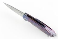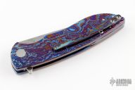 This Micro Sting Flipper by Herman Knives features a Raindrop Damascus blade and flipper. The handle has a milled timascus frame, tip up clip and backspacer, anodized titanium liner. Nice detent, lockup and blade seating. Rides on bearings.  Comes with original zippered case and wooden display box and pivot tool. Excellent condition.