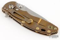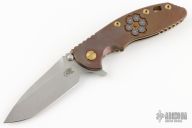 This XM-18 by Rick Hinderer features a tumble finish blade with notched thumbrest and flipper. The handle has a tumble and anodized finished titanium frame, and a tip up or down reversible stonewashed titanium clip. Lanyard hole at the butt. Comes with original box and extra washers. Also includes original hardware, filler tab, liner, spacers, and pivot. Has patina, excellent condition.
