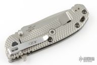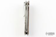 This Hinderer Designed 0561 Framelock Flipper has a stonewashed drop/ spear point blade with swedge, notched thumb rest, dual thumb studs and flipper. Handle is G10 and stonewashed titanium - with stainless steel lockbar insert and lockbar stabilizer. Stainless steel clip is tip down. Dead center blade seating, flips like a champ, and has rock solid lockup. Extremely well-made piece, #1802. Excellent condition.