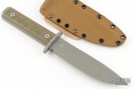 This knife features a bead blasted drop point blade with a notched thumbrest and a full tang construction.  .227" Blade Stock.  1.372" Blade Depth.  The handle has a steel guard with green G10 scales.  Includes a kydex sheath.  Excellent condition.