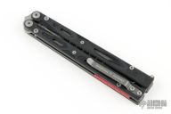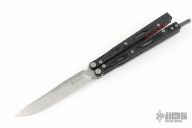 This Balisong by Maxace Knives features a satin finished 14C28N blade with false top edge. The handle has black G-10 scales, titanium liners , red aluminum  spacers, tip up stainless steel clip and T-latch. Comes with original box and trainer blade. Excellent condition.