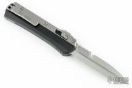 This Glykon by Microtech features a stonewashed double edged blade with fullers and notched thumbrest. The handle has a black aluminum chassis with bead blasted titanium overlays and tip down clip. Comes with original box and papers. Dated 06/2023 and #2024. Excellent condition.