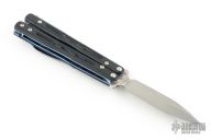 This Model 32 Morpho Balisong by Benchmade has a stonewashed spear point D2 stainless steel blade. Handle is black G-10 with blue anodized titanium liners and milled stainless steel spacers. Blue anodized titanium tip up clip. Has some scratches and oxidation, has been used and sharpened, otherwise good user condition. Comes with original box and papers.