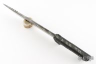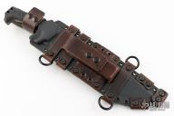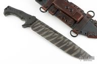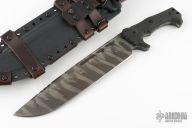 This Custom M-28 from Miller Bros. Blades features a clip point blade with fullers and notched thumbrest, false top edge, .322" blade stock and 2.298" blade depth, full tang construction. The handle is comprised of carved black G-10 scales, textured tang. Lanyard hole on pommel. Includes kydex and black leather sheath with belt loop. Excellent condition.