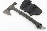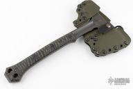 This Custom Tomahawk by Miller Bros Blades features a black blade with hammer marked flats and hammer pole, .333" blade stock and 3.75" blade depth, full tang construction. The handle has black G-10 scales. Comes with a kydex sheath. Has some scuffs, has a small ding in the edge, has been used, otherwise good condition.