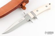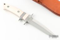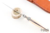 This Loveless Style Baby Bear by Thad Buchanan features a mirror polished blade with a sharpened top edge, .205" blade stock and 1.167" blade depth, full tapered tang construction. The handle has a satin finished stainless steel guard and sub-hilt, mammoth ivory scales with red liners, stainless steel pins and lanyard hole. Comes with brown leather sheath and a zippered case. Excellent condition.