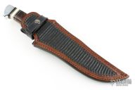 This Bowie by Alan C Warren features a hand rub satin finished blade with false top edge, .277" blade stock and 1.935" blade depth, hidden tang construction. The handle has a stainless steel guard and aluminum butt, desert ironwood grip, black/nickel silver/brass/walrus ivory spacers. Comes with hand tooled black/brown leather sheath. New  condition. #2531