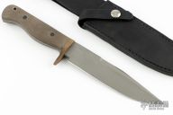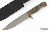 This Combat Woodsman Fighter by Flat Rock Forge features a bead blasted blade with false top edge, .189" blade stock and 1.239" blade depth, full tang construction. The handle is comprised of a bead blasted brass guard and black canvas micarta scales. Lanyard tube in pommel. Includes leather sheath with belt loop. Has some scuffs and scratches, great condition otherwise.