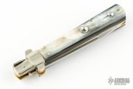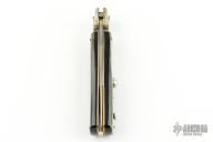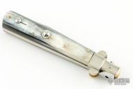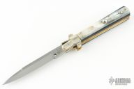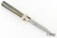 This Fosolone Auto by Renzo Passcotto features a mirror finished blade with false top edge. The handle horn scales, brass liners and nickel silver bolsters. Has safety. Includes a leather slip sheath. Excellent Condition.