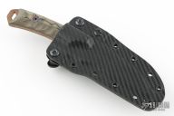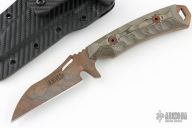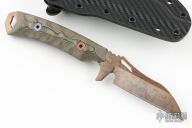 This Revelation by Dawson Knives features an Arizona Copper finished blade with notched thumbrest, .133" blade stock and 1.029" blade depth, full tang construction with black/tan/green G-10 scales. Comes with a kydex sheath. Excellent condition.