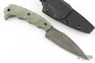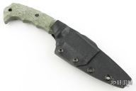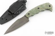 This HUMNIT Dagger by Half Face Blades features a dark stonewashed blade with sharpened top edge and textured thumbrest, .156" blade stock and 1.146" blade depth, full tang construction. The handle has green Terotuff scales. Comes with kydex sheath with belt clip. Excellent condition.