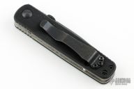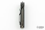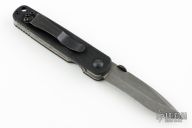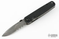This knife features a stonewashed black drop point blade with partial serrations and a knurled thumb disc. The handle has g-10 scales over titanium liners and a black tip up pocket clip. Excellent Condition.