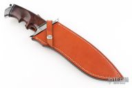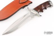 This Raptor Fighting Bowie by Bill Luckett features a mirror polished recurve blade with sharpened top edge, .239" blade stock and 1.936" blade depth, hidden tang construction. The handle has a mirror polished stainless steel guard and butt, desert ironwood burl grip with black linen micarta and stainless steel spacers. Comes with a brown leather sheath and a zippered case. Excellent condition.