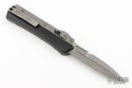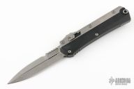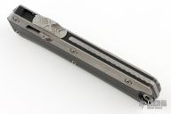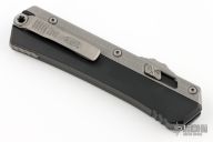 This Glykon by Microtech features a apocalyptic finished double edged blade with fullers and notched thumbrest. The handle has a black aluminum chassis with apocalyptic finished titanium overlays and tip down clip.  Dated 05/2023 and #1422.  Excellent condition.