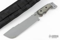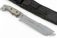 Tops Knives M4X Punisher military survival knife with micarta handle and gray 8.50" plain edge 1095 high carbon alloy Blade, .253" blade stock and 2.136" blade depth, full tang construction. Teeth on the spine allow for raw cutting power like getting through thick brush. Overall length of 13.50" and includes durable nylon sheath. Designed by Daniel M Certo. Made in the USA. Excellent condition.