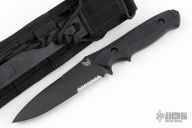 This Nimravus by Benchmade has a black blade drop point blade with a full tang construction. .117" Blade Stock. 1.235"Blade Depth. The handle has black aluminum scales. Includes a nylon sheath. Excellent condition.
