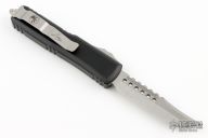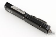 This UTX-85 OTF automatic by Microtech knives features a D/E stonewashed Hellhound blade, and a black aluminum handle with blasted hardware, tip down carry. Glass breaker. S/N 729. Dated 01/2023. Comes with original box and papers. Excellent condition.