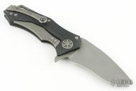 This Starlord by Marfione Custom Kives features an Apocalyptic finished blade with notched thumbrest and flipper. The handle has a G10-FR4 composite frame with an Apocalyptic titanium lockbar, tip up clip, backspacer and hardware, lanyard hole at the butt. Comes with original box, zippered case and COA. Excellent condition. Dated 05/2016.
