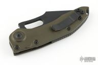 This Stitch Auto by Microtech Knives features a custom black Cerakoted blade and false top edge, notched thumb and finger rests. The handle has a custom finished and cerakoted aluminum handle with a black titanium backspacer, stainless steel hardware and clip, tip up carry, lanyard hole at the butt. This knife has been customized from its original state. Has some wear on the clip and the butt of the frame, otherwise good condition.