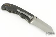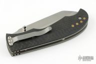 This M1 linerlock folder by Greg Lightfoot features a hollow ground satin finished blade with dual thumbstuds. The handle has bead blasted titanium liners with carbon fiber scales. Bead blast stainless steel clip, tip down carry. Has some copper pin accents on the B-side. Smooth action. Nice detent, blade seating and lockup. Excellent condition.