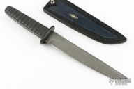 This Tanto Fighter by Duane Dwyer features a Damascus blade with false top edge, .190" blade stock and 1.372" blade depth, hidden/mortise tang construction. The handle has a carbon fiber guard, carbon fiber scales with a steel frame. Comes with a black leather sheath with stingray skin inlay by Lifter's Leather. Has some oxidation spots on the blade, otherwise excellent condition.