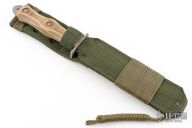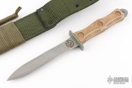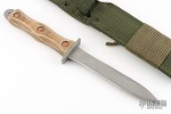 The Commando Knife is one of EKs most popular models with a bead blast finished double edged blade. The handle is wood with copper rivets. Steel double guard Full tang construction with thickness of .151" and depth of 1". Tang extends 3/4" at the butt with a lanyard hole. Includes a tan nylon sheath. Has some light scuffs, otherwise excellent condition.