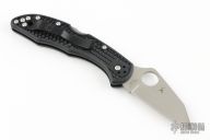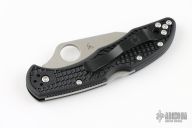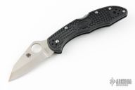 This knife by Spyderco has a satin finished blade with thumbhole opener and notched thumbrest. The handle has black FRN scales and a 4-way reversible stainless clip. Has some light scuffs, and scratches, Excellent condition otherwise.