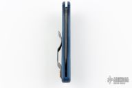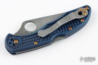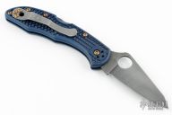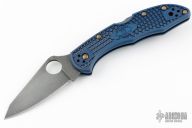 This knife by Spyderco has an acid wash finished blade with thumbhole opener and notched thumbrest. The handle has blue FRN scales and a 4-way reversible stainless clip. Has some light scuffs, and scratches, Excellent condition otherwise.