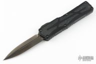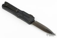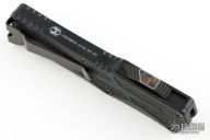 This Colossus by Heretic Knives features a hand ground DLC dagger blade with fullers. The handle has a black aluminum frame with non-slip inlays, checkered thumb slide inlaid with fat carbon snake skin inset, DLC stainless steel tip down clip. Comes with original box and COA. #027. Excellent Condition.