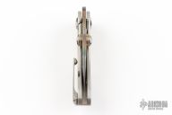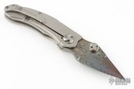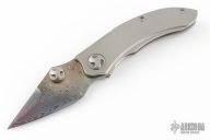 The Viper by Glenn Waters features a Damasteel blade with dual thumbstuds. The handle is composed of an orange peel finished titanium frame and tip up clip that has been laser engraved, has stainless lockface insert, rides on bearings, nice detent, lockup and blade seating. Nice action, lock up and blade seating. Comes with original box, COA and zippered case. Dated 2017. Excellent Condition.