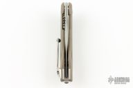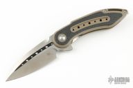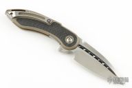 This Mini Glimpse by SteelCraft and Todd Begg features a satin finished spear point blade with fullers and a flipper. The handle has a tan G-10 frame with carbon fiber inlays, titanium backspacer and tip up clip. Rides on IKBS bearings, nice detent, lockup and blade seating. Excellent condition. Comes with original box and papers.