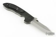 This Emerson Horseman linerlock folder has a tumble finish blade with swedge, thumb disc, notched thumb rest and wave feature. The handle has black G10 scales over titanium liners and black spacers. #2184. Includes the original box and papers.  Excellent Condition.