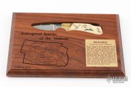 This vintage lockback by Kershaw features a mirror polished blade with nail nick. The handle has brass bolsters and stainless steel liners, bone scales with scrimshaw by GD dated 1983. Comes with original wooden display plaque. Excellent condition.